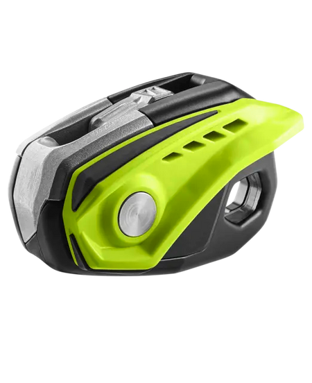The four-way safety lock allows inserting the rope without having to separate the device from the karabiner. Steel inserts in the especially burdened spots increase the service life of the device.
