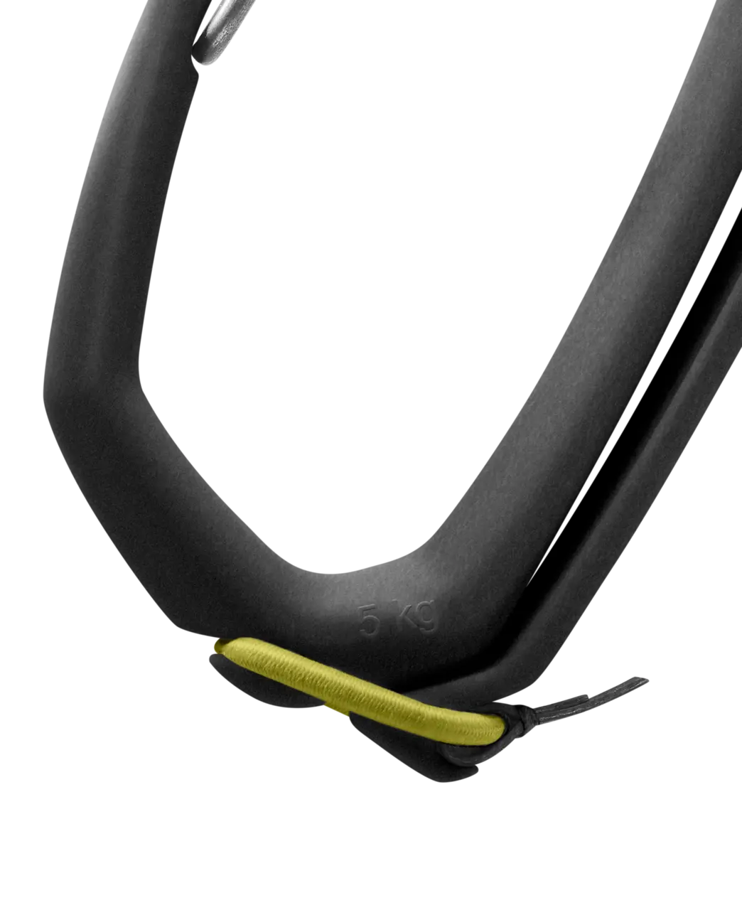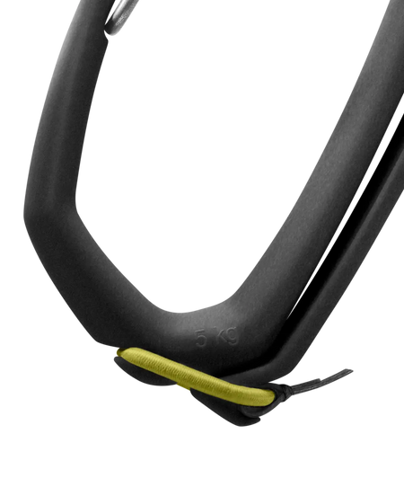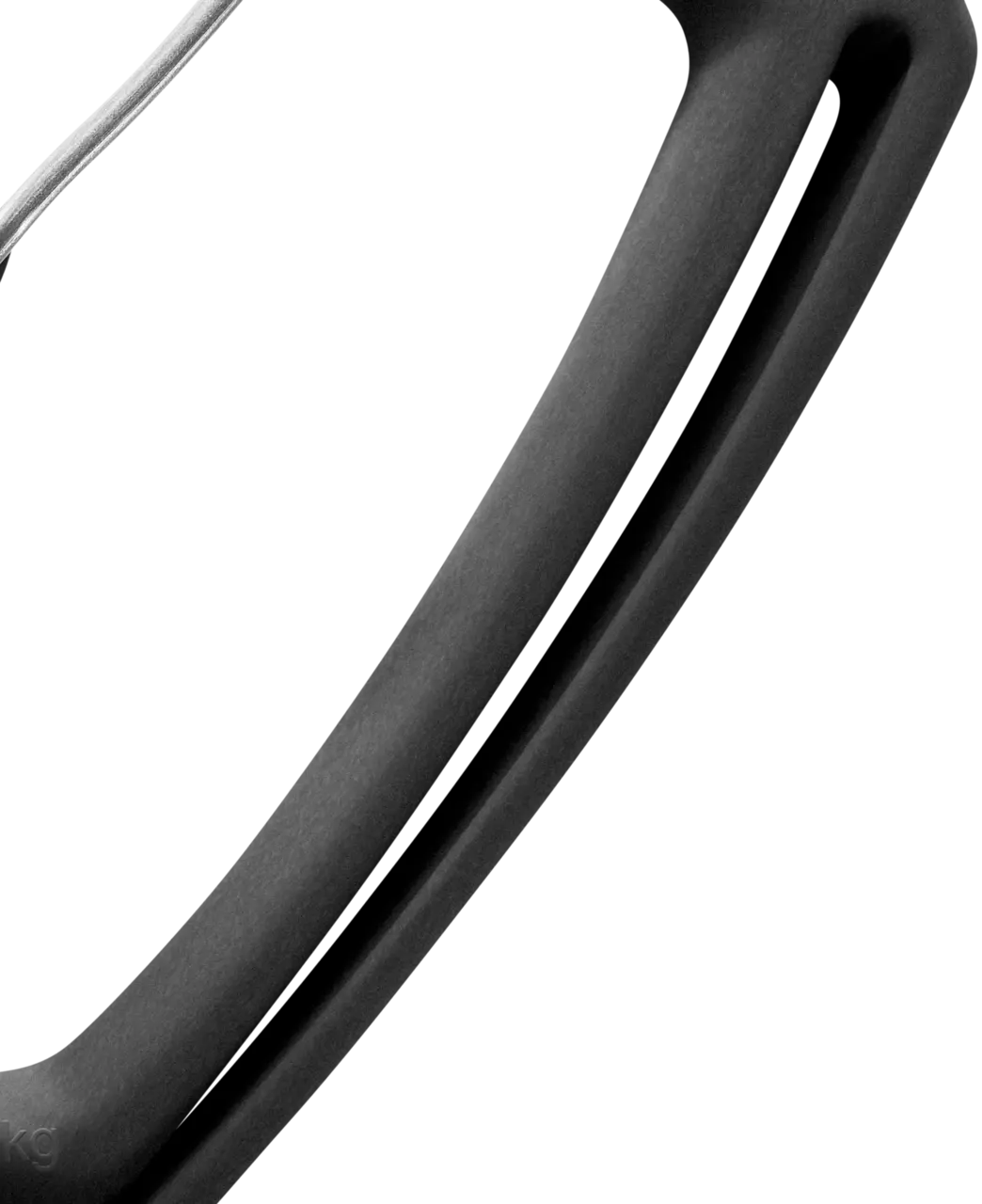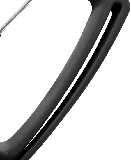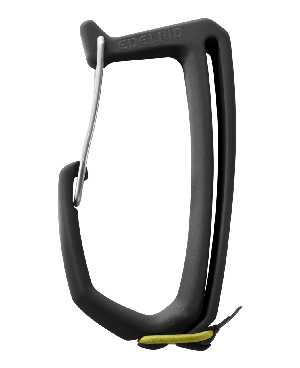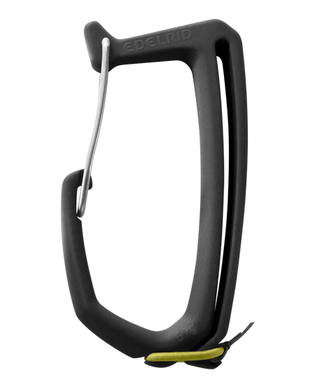 Large gear carabiner for clear storage and organization of ice screws and other climbing equipment on the harness. Made from recycled rope material.