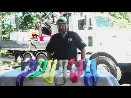 Endless round slings in Green, Yellow, Tan & Red with vertical capacities 5,300–13,200 lbs and basket to 26,400 lbs. See more information for custom sizes.