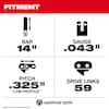 - Recommended for use with M18 FUEL 14" Top Handle Chainsaw (2826-20T) and 14" .325" Low Profile Pitch, .043" Gauge Guide Bar (49-16-2745)