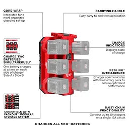 Milwaukee M18™ Six Bay Daisy Chain Rapid Charger - Charges up to 60 M18™ batteries overnight, dual modes for rapid daytime or overnight charging, PACKOUT™ compatible, portable design.