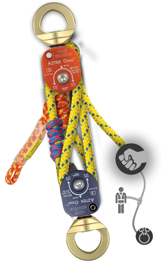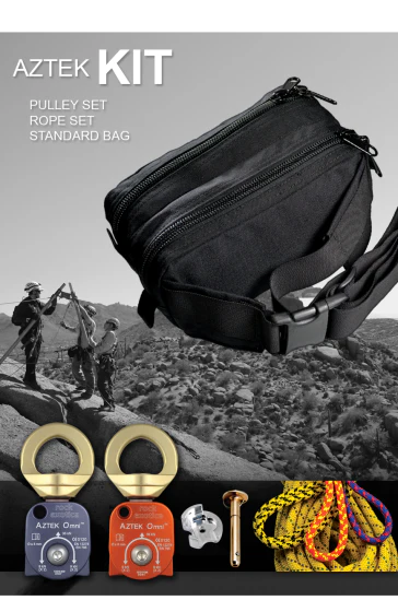 The AZTEK system has become the ultimate Personal Mechanical Advantage kit that can be configured as a 5:1, or 4:1 with a re-direct by just rotating the system. The AZTEK can be used as a pick off, adjustable directional, high directional guyline, high angle attendant tether, high angle litter scoop, load release hitch and much more. Each pulley is color coded to match with a corresponding prusik for quick identification. The AZTEK pulleys are machined from solid aluminum, feature swivel connection points, and utilize high efficiency bearings