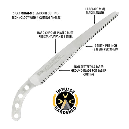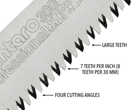 The Silky Gomtaro 300 utilizes proprietary Silky MIRAI-ME (Smooth Cutting) Technology - The Teeth of the Future! The precision-ground, razor-sharp teeth with four cutting angles provide fast, clean and extremely smooth cutting action. Great combination of high performance blade with an integrated non-slip cushioned comfort rubber handle that really sticks in your hands. Durable black polypropylene sheath with belt clip is included.